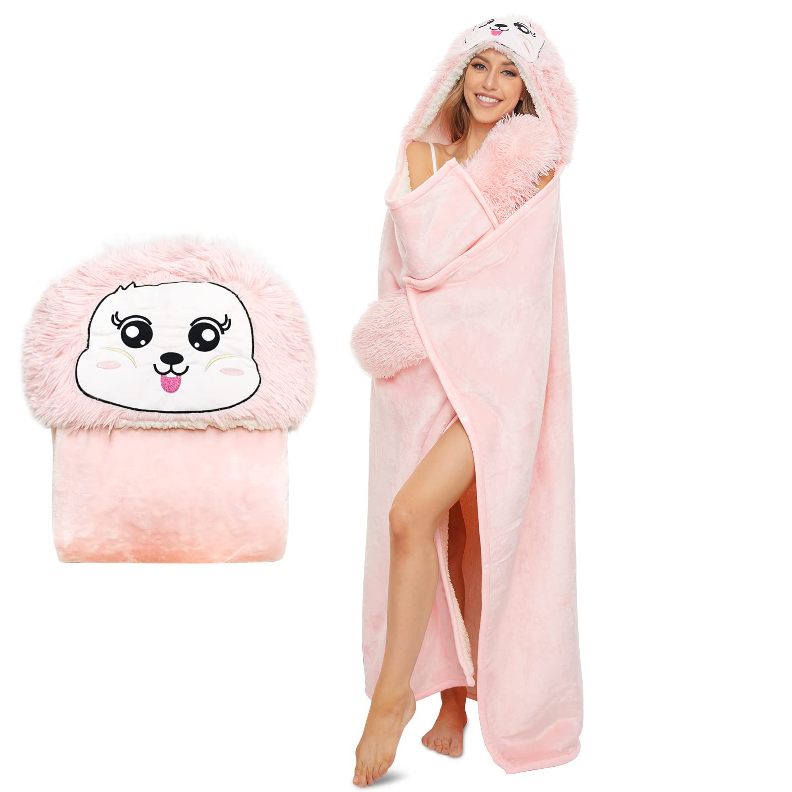 Wearable Hooded Blanket for Adults - Adorable Soft Cozy Plush Flannel Fleece & Sherpa Hoodie Throw Cloak Wrap - Sloth Gift for Women (Pink Fur)