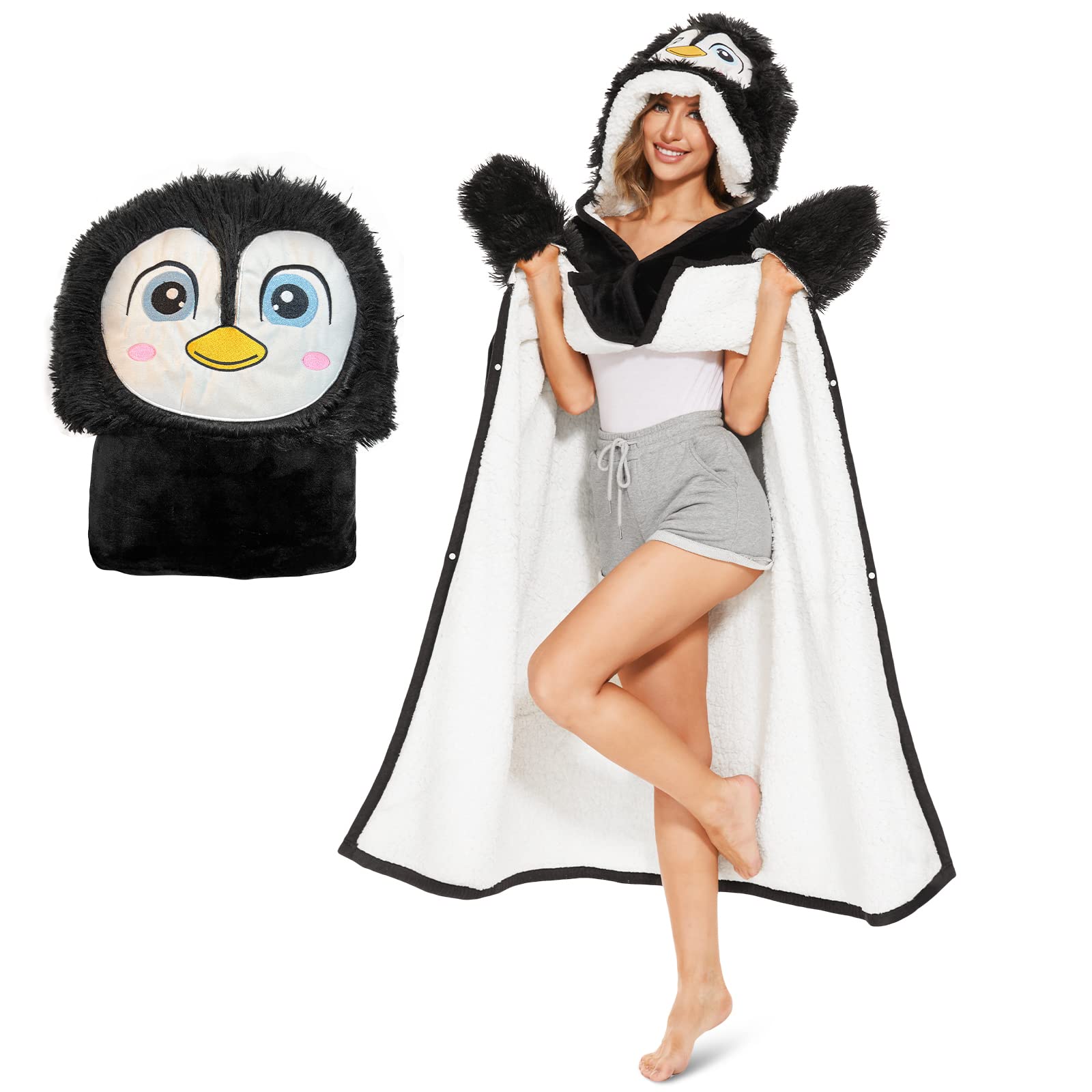 Wearable Hooded Blanket for Adults – Fuzzy Super Soft Warm Cozy Plush Flannel Fleece & Sherpa Hoodie Throw Cloak Wrap - Penguin Gifts for Women Adults Girls and Kids
