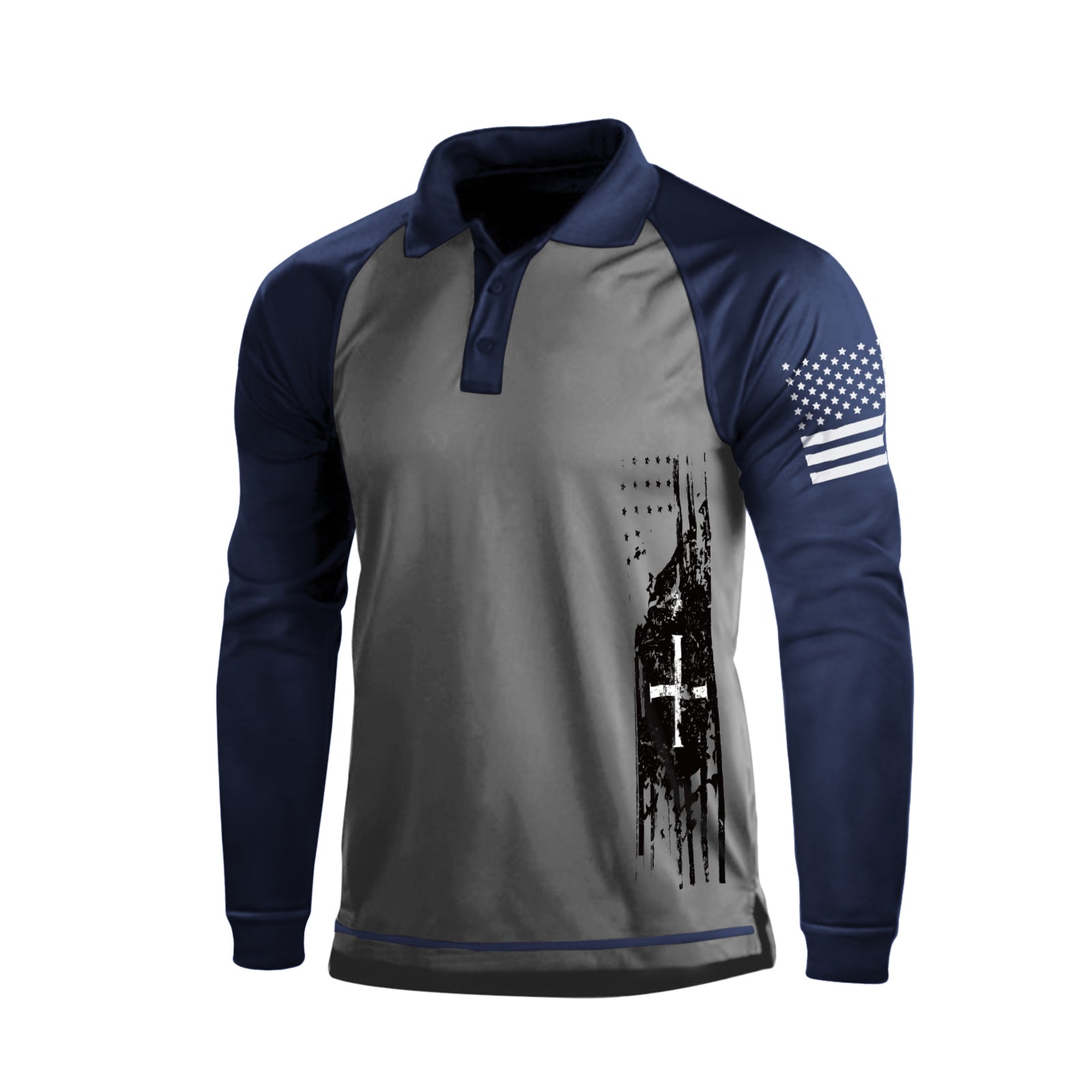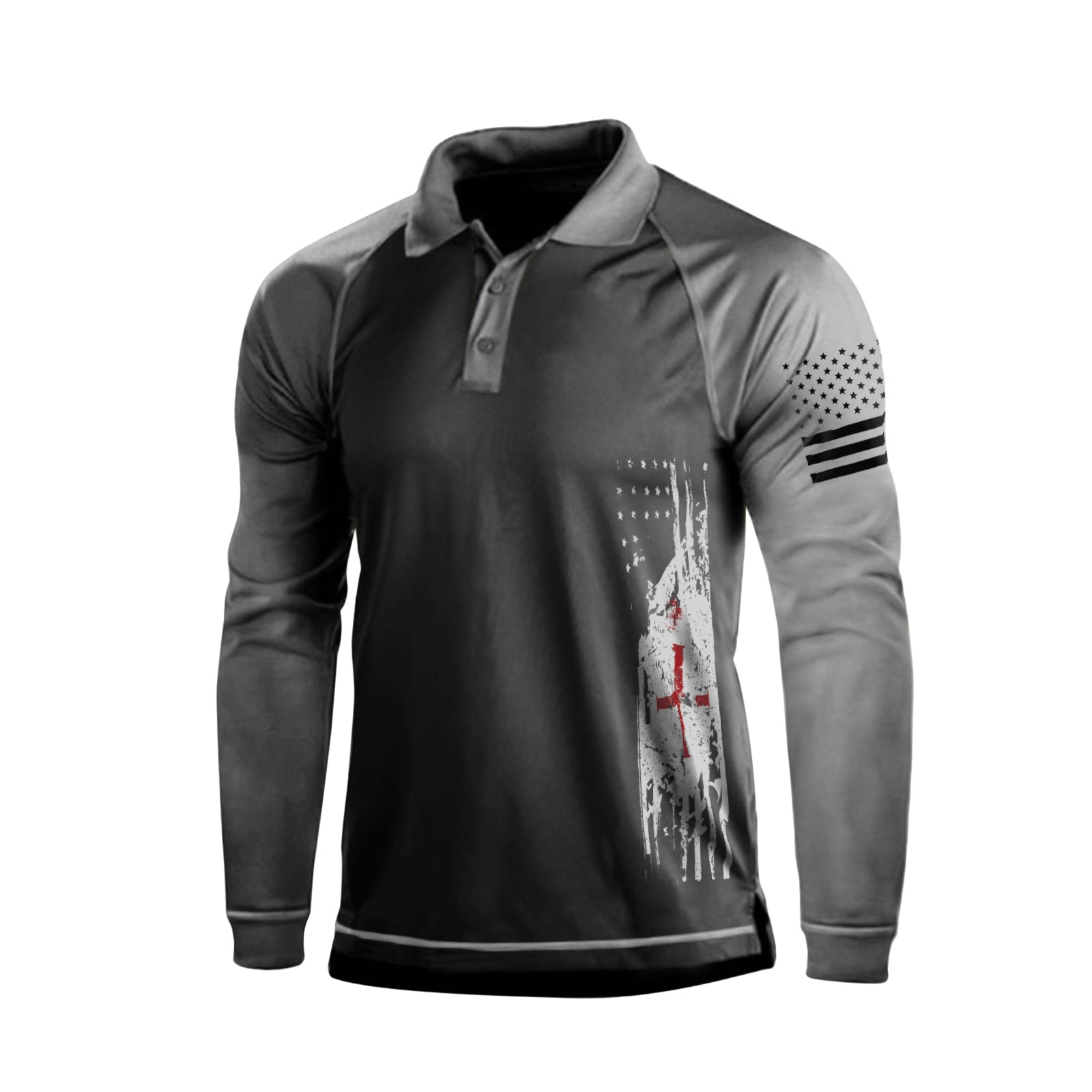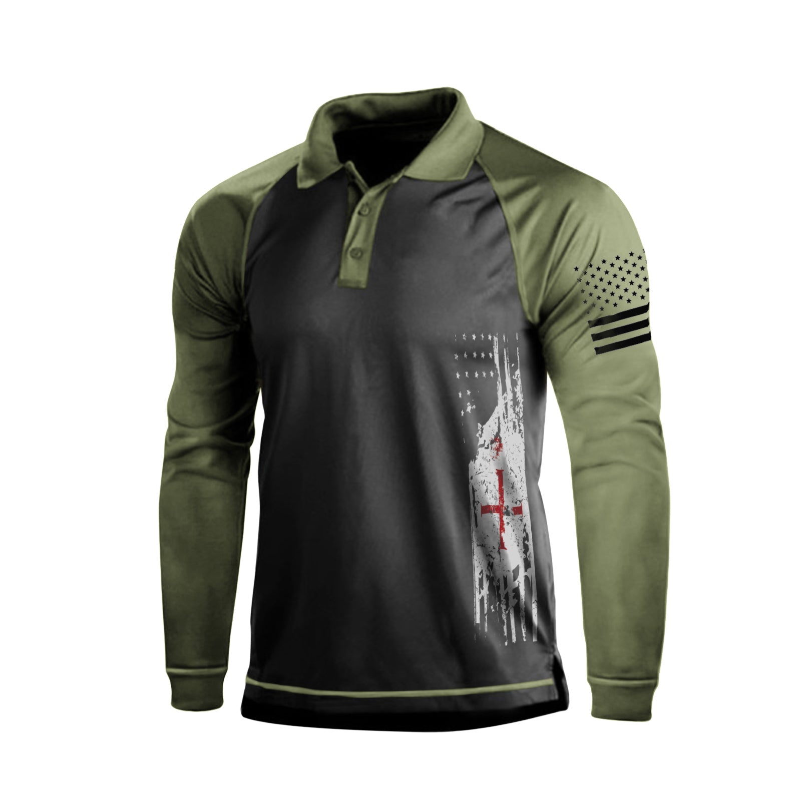 USA FLAG CROSS GRAPHIC RAGLAN LONG SLEEVE POLO SHIRT
