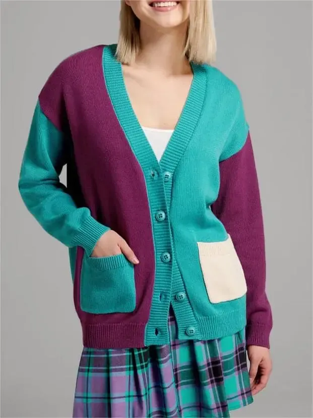 This fashionable button up sweater is made of cotton knit fabric, featuring asymmetrical inserts in blue-green and plum colors, contrasting ivory pockets, long sleeves, deep V-neck with button closure, front patch pocket, and ribbed knit details on the collar, cuffs, and hem. This soft and elastic sweater is designed specifically for the buttocks and is a unique layered piece that is very interesting in autumn and beyond.
