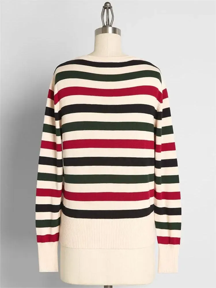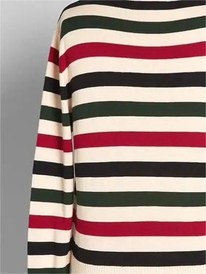 This cardigan is covered in contrasting black, red, and green wide horizontal stripes throughout the body, unexpectedly festive during the holiday season, fashionable enough to be worn year-round! This button up sweater is made of elastic cotton knit, with long sleeves, ivory cuffs, collar, and hem featuring ribbed knit details.
