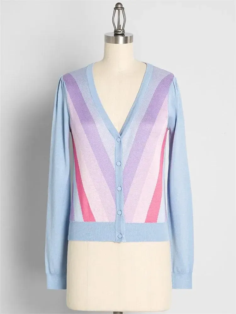This light blue sweater is inspired by the 1950s college button up sweater and will earn you important points for your retro fashion game! This fashionable woolen sweater is made of soft knitted fabric, with vertically sloping rainbow stripes on the front that converge into a V-shape. These stripes come in shades of violet, light purple, light pink, and dark pink cream, with a V-shaped neckline, long sleeves, and button closure.