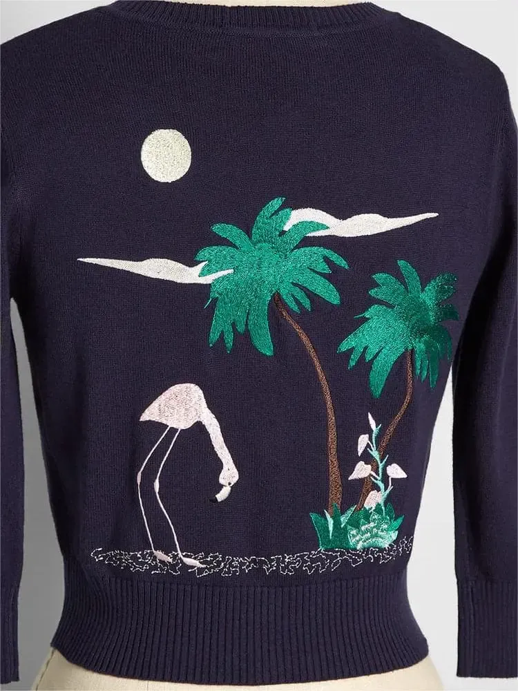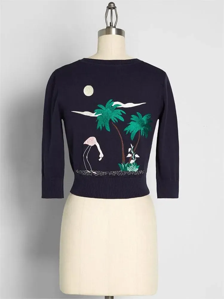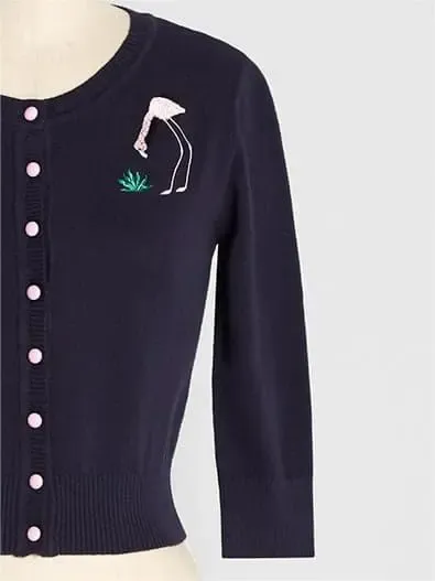 This navy blue sweater is exquisite and delightful, bringing tropical charm wherever you go. This retro style button up sweater is made of cotton knitted fabric, with sleeves that are 3/4 long, a round neckline, and a front button closure.