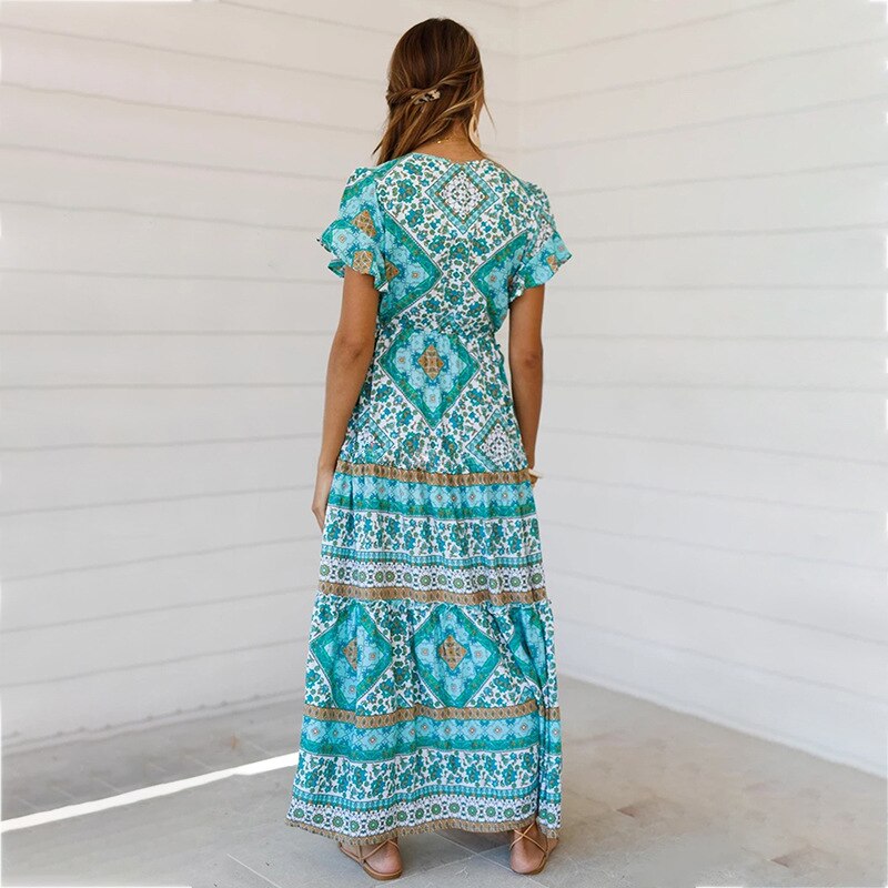 Designer Women's Summer Holiday Dress Retro Printed V-neck Long Dress