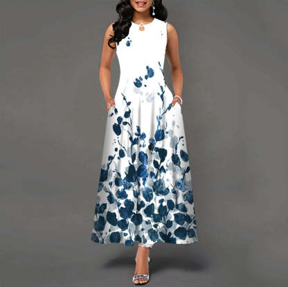 Sleeveless Flower Print Pleated Flared Round Neck Maxi Dress