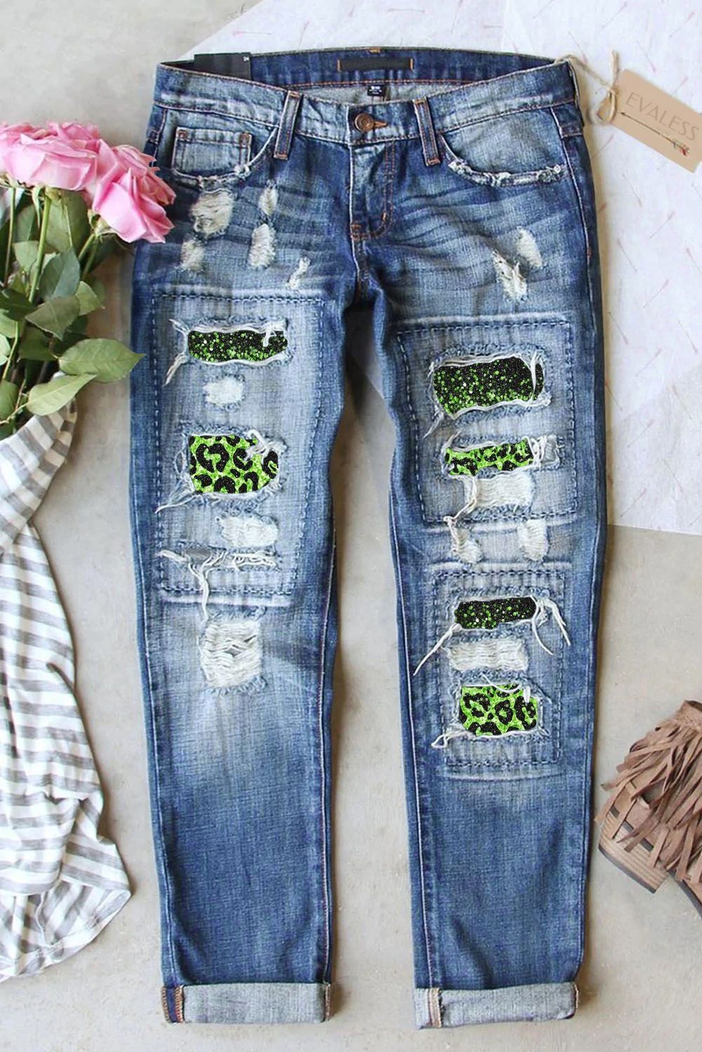 St. Patrick's Day Green Shiny Leopard Shift Casual Ripped Jeans