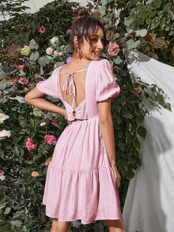 Women Tie Back O-ring Detail Puff Sleeve Ruffle Hem Dress