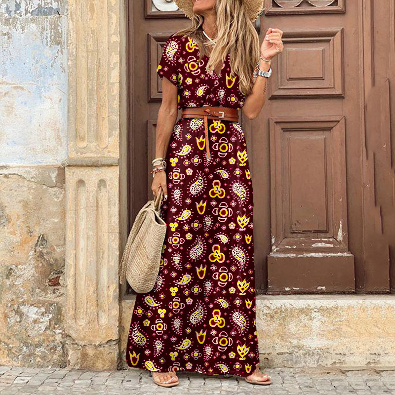 V-Neck Short Sleeve Boho Maxi Dress