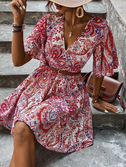 Plus Size Allover Paisley Print Tie Back Butterfly Sleeve Dress Without Belt