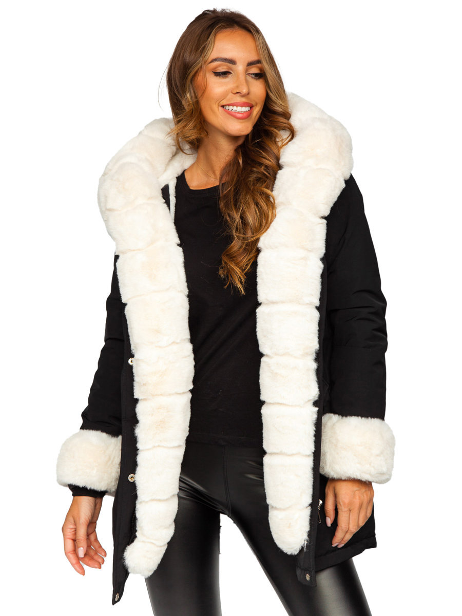 Black women's winter parka jacket with hood