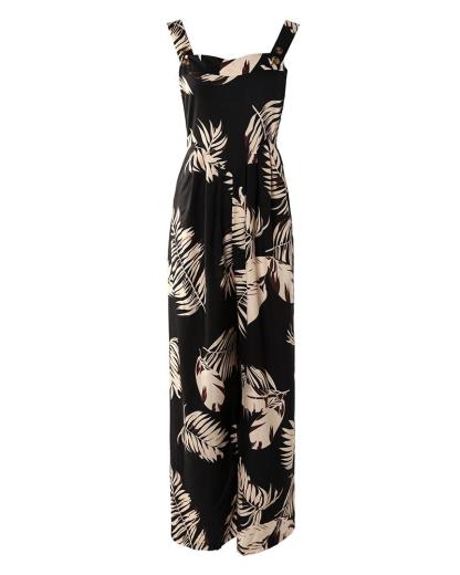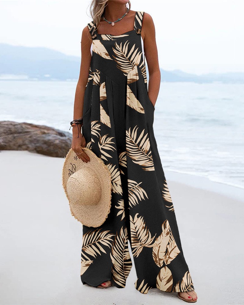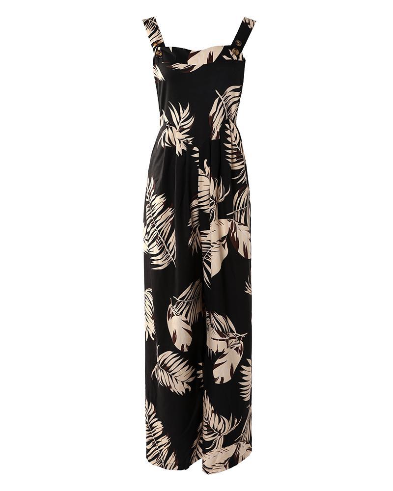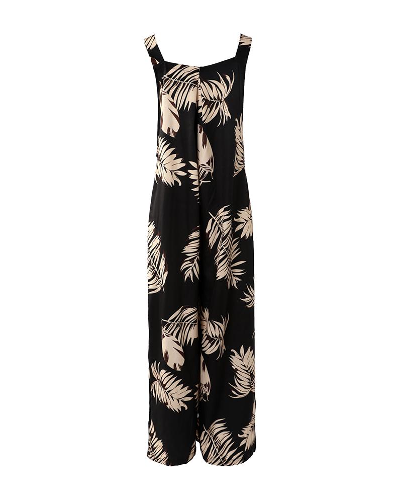 Leaf Print Wide Leg Suspender Jumpsuit