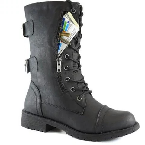 Women Lace up Mid Calf Hide Credit Card Knife Money Wallet Pocket Boots